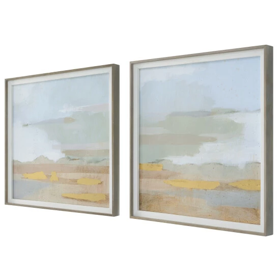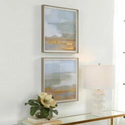 These serene landscape prints are shown under glass featuring clay, sage, and light blue tones with gold leaf accents. Each print is accented by a linen liner and a natural wood tone frame. Artwork by Victoria Borges.