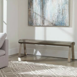 Contemporary in style, this bench features a solid acacia wood seat naturally finished with a light grey wash supported by steel legs finished in a brushed pewter plating. Solid wood will continue to move with temperature and humidity changes, which can result in cracks and uneven surfaces, adding to its authenticity and character.