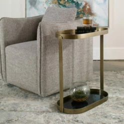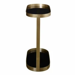 Simple lines with versatile styling, this thick stainless steel accent table is finished in antique gold, featuring black glass inlaid shelves.
