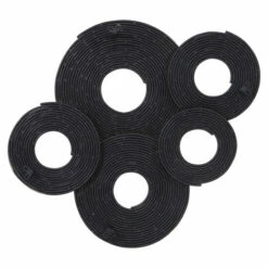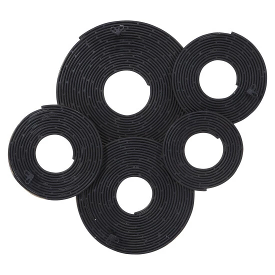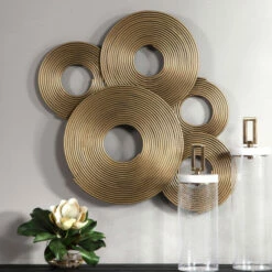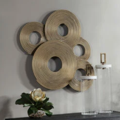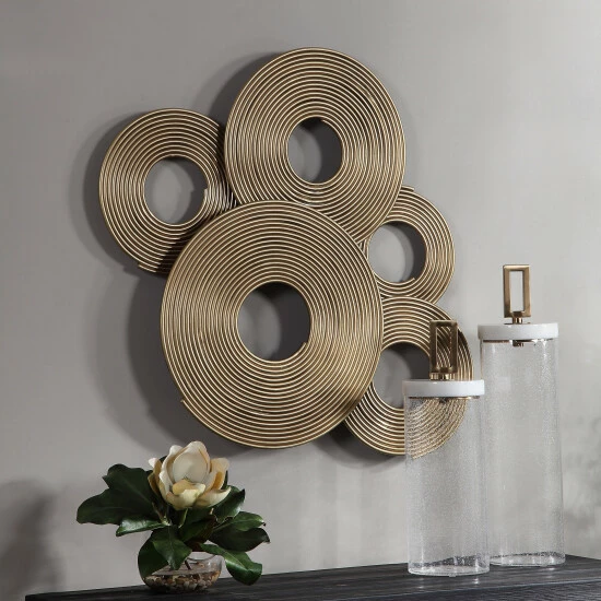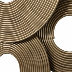 A 3-dimensional layering of spiraled iron rings featuring a soft gold finish. May be hung three ways.