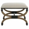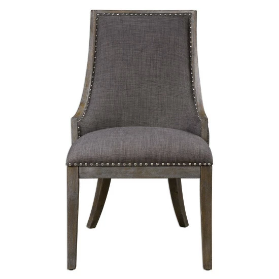 Curved back design in warm charcoal grey linen, accented by polished nickel nail head trim. Birch wood frame in honey stain with heavy grey wash. Seat height is 20 inches.