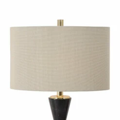 Mid-century flair is added to this design featuring an hour glass shaped base constructed of solid, black marble and is accented with stainless steel details finished in a plated gold and a thick crystal foot. The oval hardback drum shade is a beige linen fabric with vertical subbing.