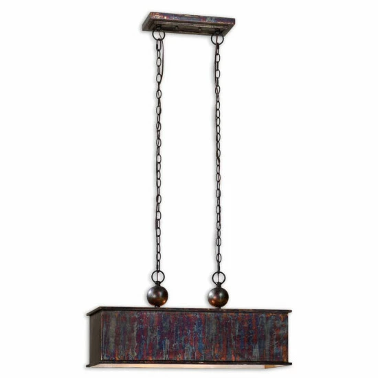 Transform any room into a rustic oasis with this Uttermost Albiano two-light oxidized bronze rectangle pendant. Bursts of red, blue, moss and purple hues intermingle deftly with the oxidized bronze base, creating a visual explosion of color that is reminiscent of Old West furnishings and decor.