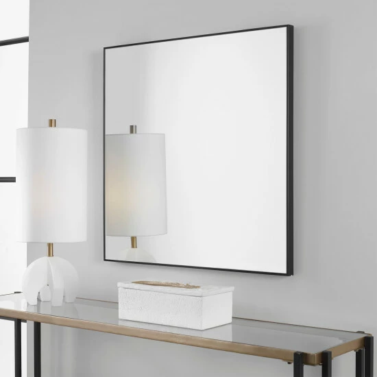 Sleek and sophisticated, this square mirror features a clean and simple frame finished in matte black. Perfect for grouping multiples together to create a striking wall installation.