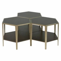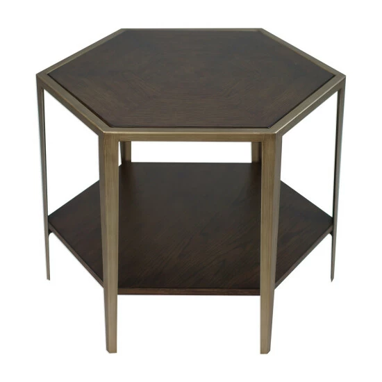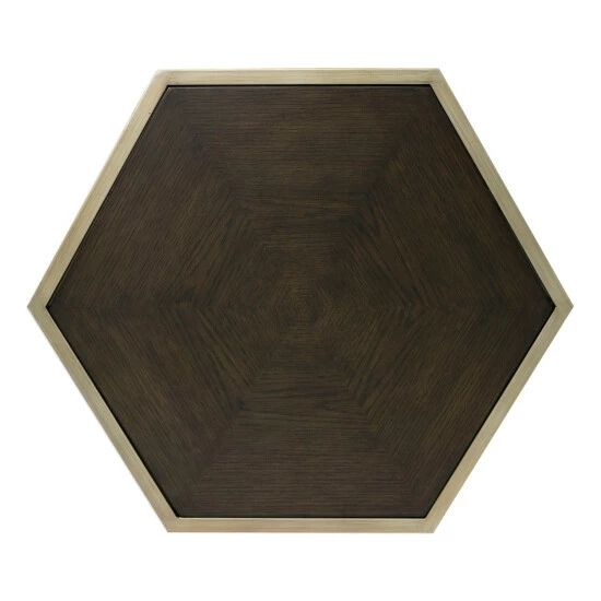 A fun hexagonal accent, perfect for bunching in multiples to create a geometric coffee table, featuring a sunburst inlay oak veneer finished in a deep walnut surrounded by an iron frame in brushed champagne.