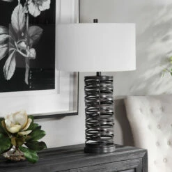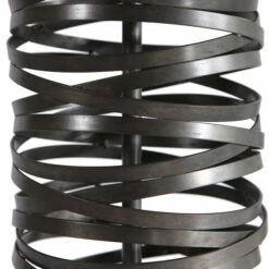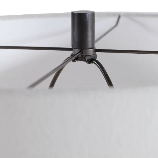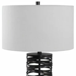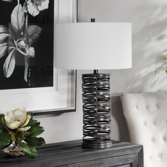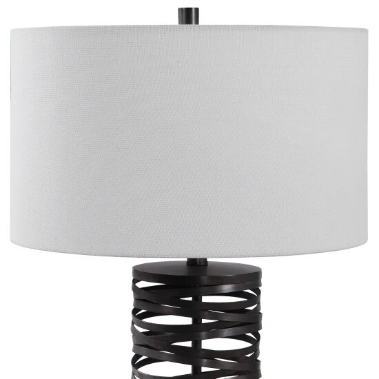 Add a touch of industrial flair with this table lamp that features overlapping straps of metal finished in a aged rust black. The round hardback shade is a white linen fabric.