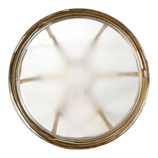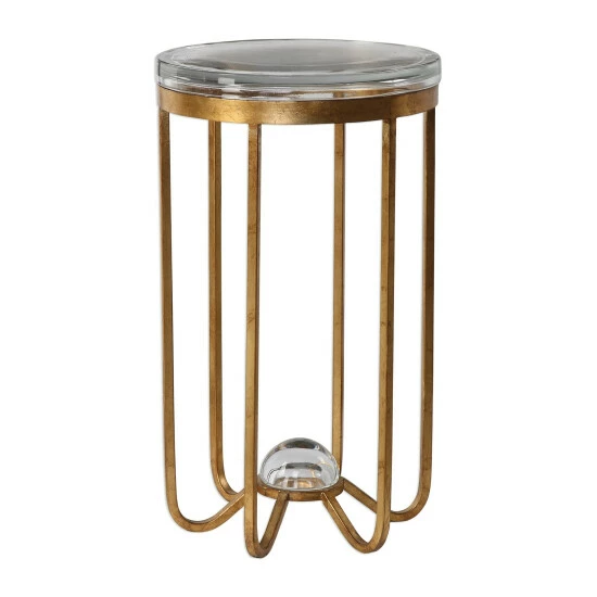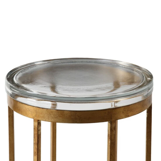 Thick rounded block glass, on elegant hand forged iron with a hand applied, lightly antiqued gold leaf, creating this classic glam accent piece.