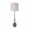 Turn a lonely armchair into a cozy reading nook with this one-light floor lamp featuring a light beige linen shade that casts a soft and warm glow. This sleek floor lamp with a tapered, round hardback shade and brushed nickel-plated detailing uplifts your contemporary decor. Blue glass around the stem and bronze sugar spun accents up the glam quotient of this fixture.