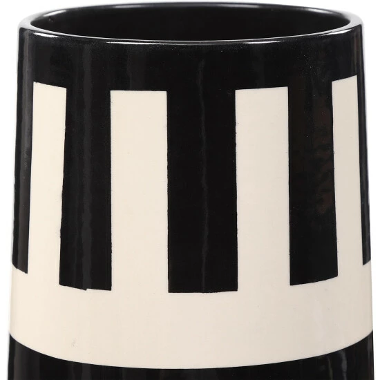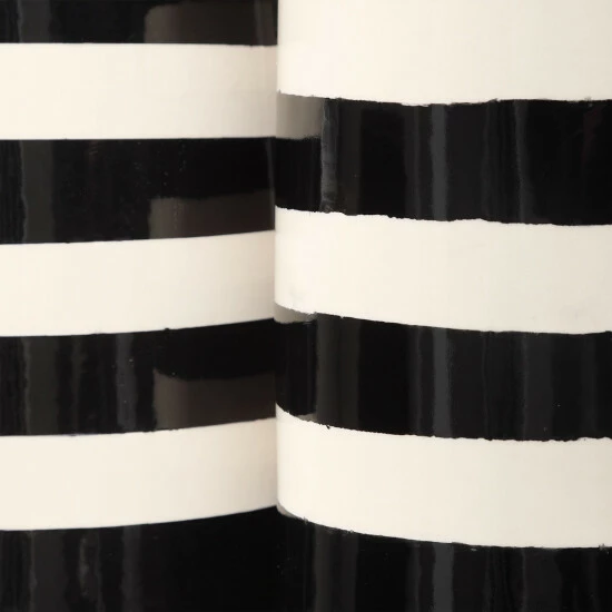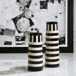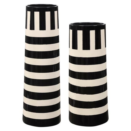 Set of two ceramic vases are finished in a contemporary black and white striped motif, inspired by tribal designs.