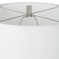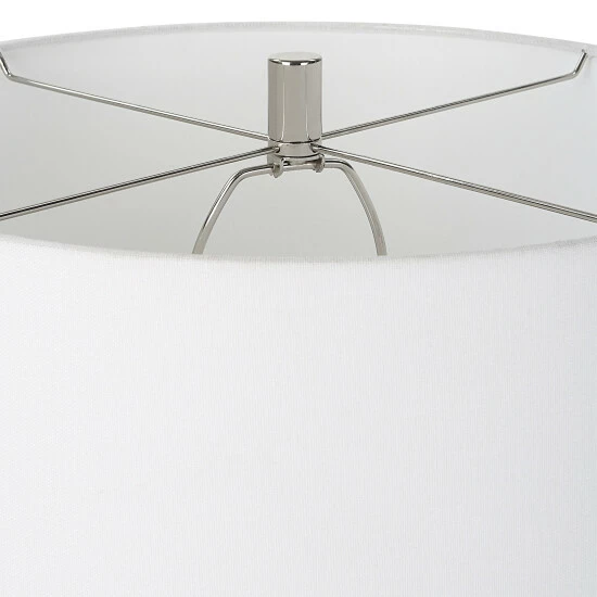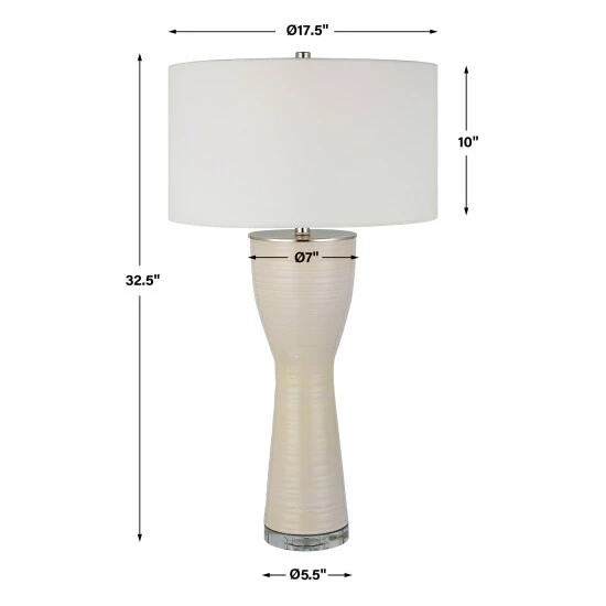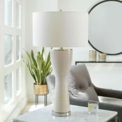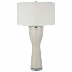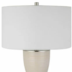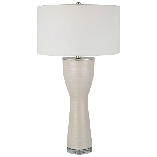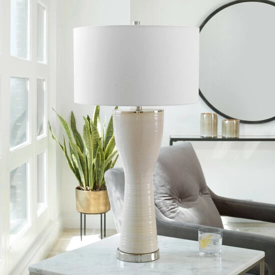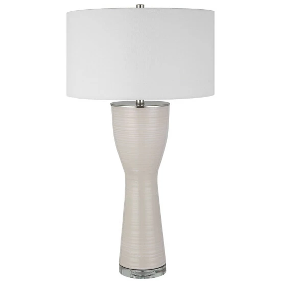 This ceramic table lamp displays an elegant curved silhouette that creates a fresh yet traditional feel. The base is finished in an off-white crackle glaze and is accented by polished nickel plated details. The lamp is complimented by a white fabric drum shade.