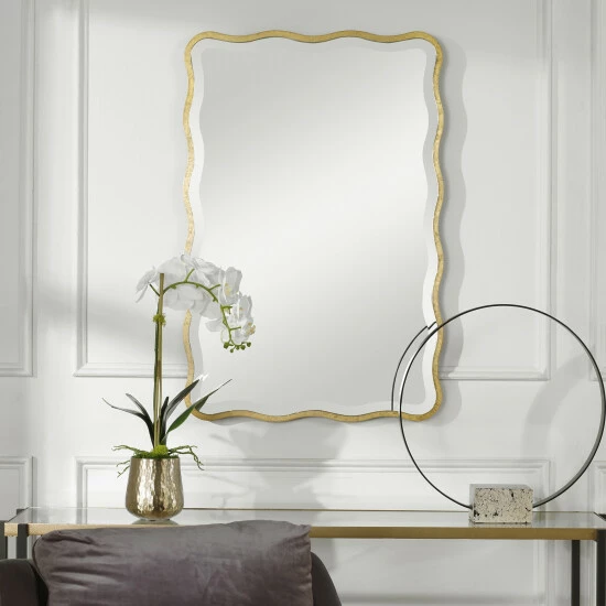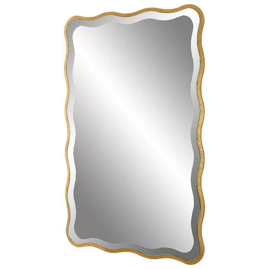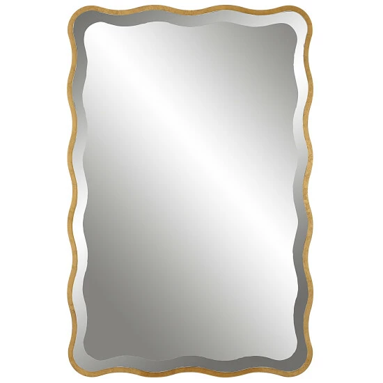 Showcasing a feminine scalloped edge, this shaped wood mirror adds whimsical flair to any design. The mirror is finished in aged gold and has a 1″ bevel.