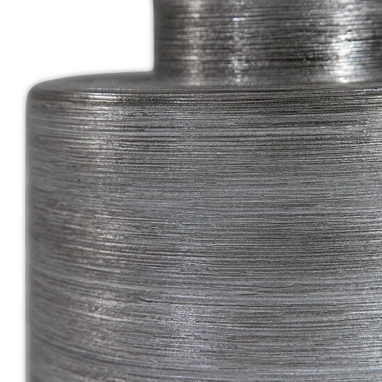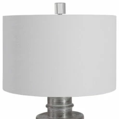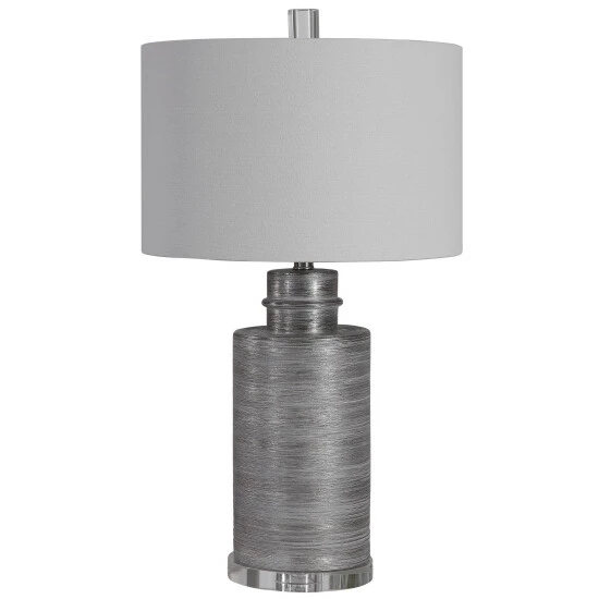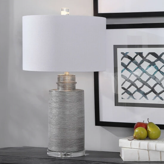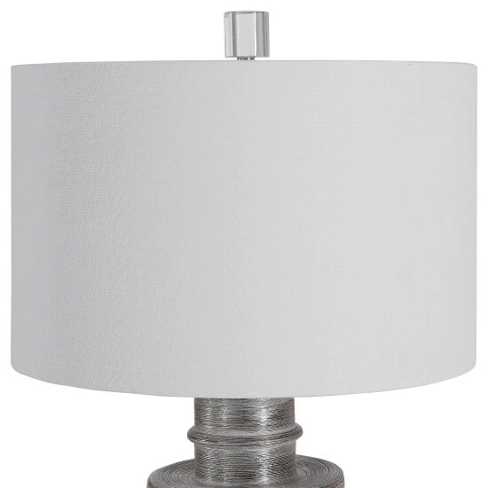 This ceramic table lamp showcases a light ribbed texture finished in a metallic silver leaf, paired with elegant crystal details and brushed nickel plated accents. The hardback drum shade is a white linen fabric.