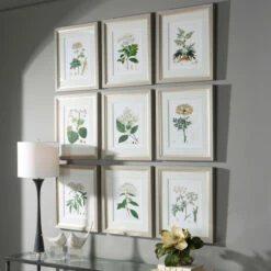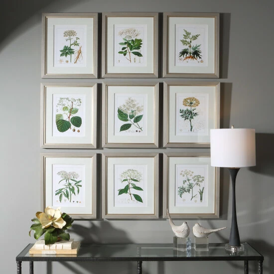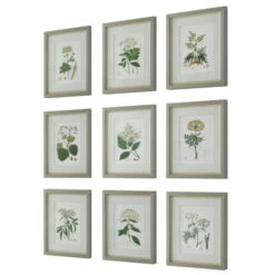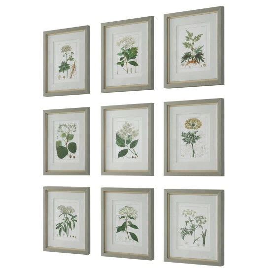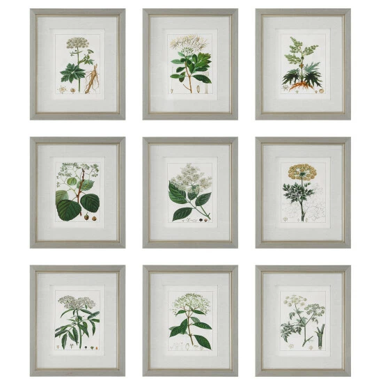 This set of nine botanical prints were originally created by french botanist and illustrator pierre turpin in the early 19th century. Each work of art is accented by an oatmeal linen wrapped mat and a light gray wood tone frame with a petite champagne liner. Prints are under glass.