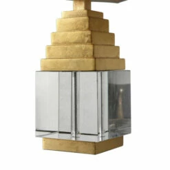 This petite statement features a thick crystal cube, paired with a metallic gold leaf pyramid design. The square hardback shade is a light beige linen fabric with natural slubbing.