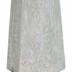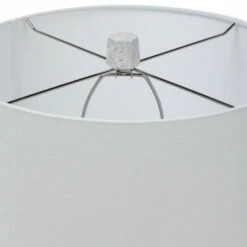 This table lamp showcases a tapered base in a concrete look with crisp edges and porous texture finished in off-white, light grey, and taupe tones, paired with brushed nickel accents. The round hardback drum shade is a white linen fabric.