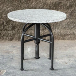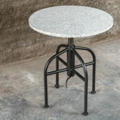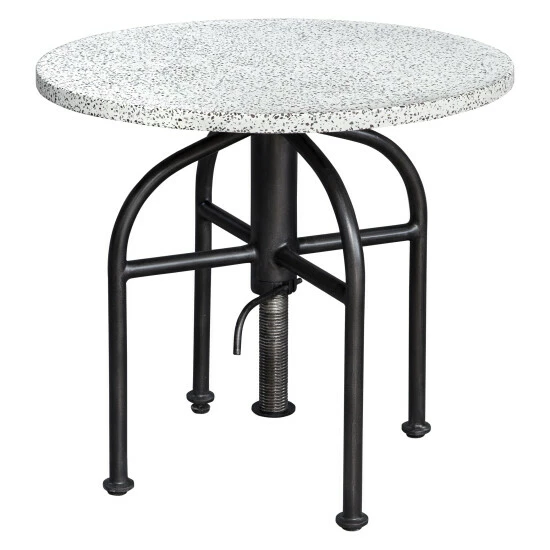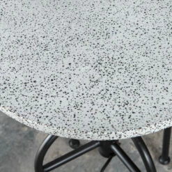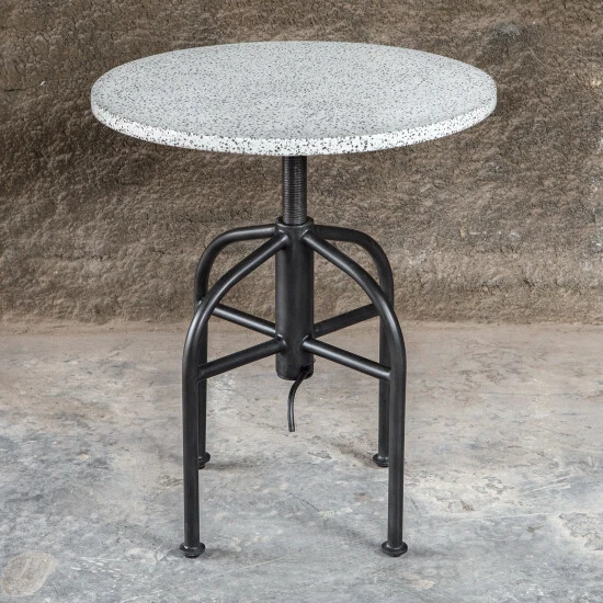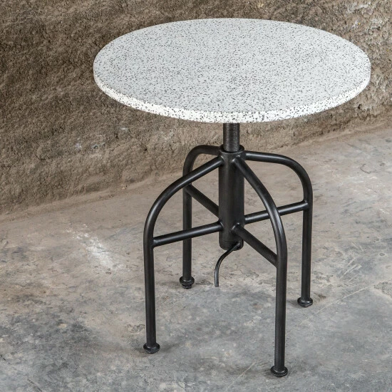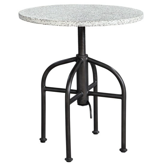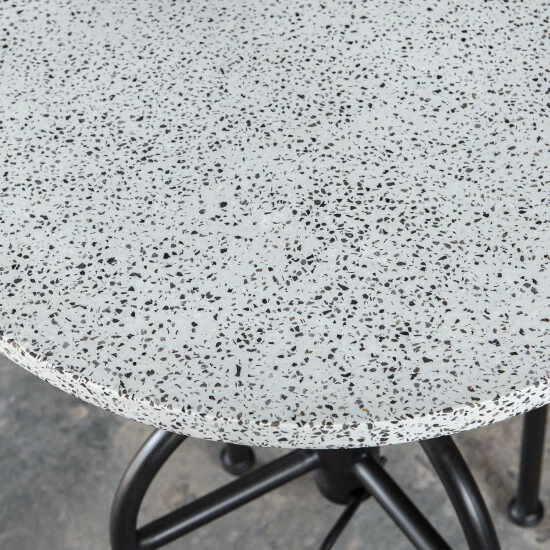 Inspired by scandinavian style, this adjustable height accent table features a white and gey flecked terrazzo stone top, on an industrial style metal base finished in matte black.
