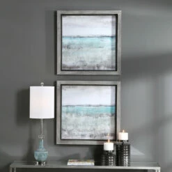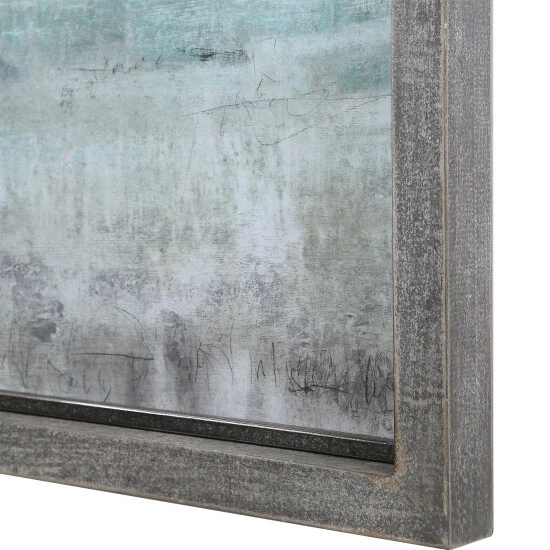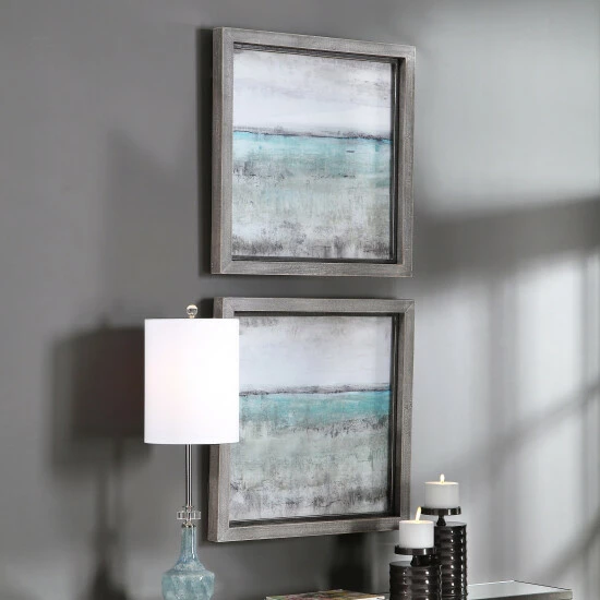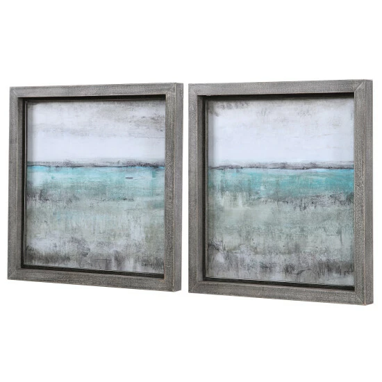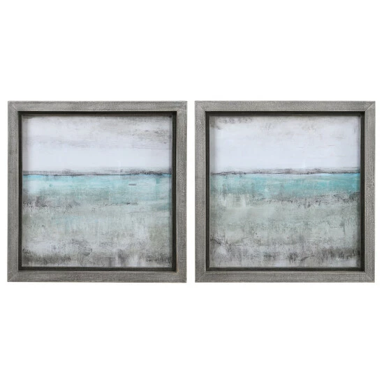 These framed landscape prints showcase shades of aqua, sea foam green, light grey, and ivory with a rustic grey frame accented by heavy distressing and a bronze inner lip. Each print is placed under protective glass.