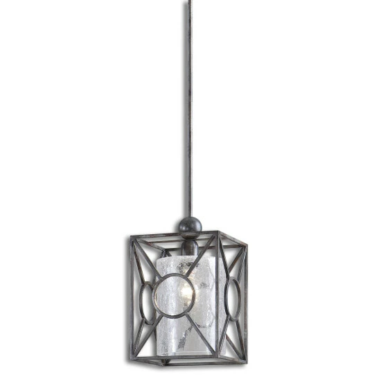 This mini pendant features rust black metal with aged grey undertones and a crackled glass cylinder inner shade. The lovely pendant is in a one-light configuration.