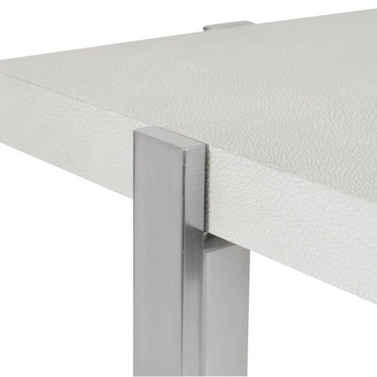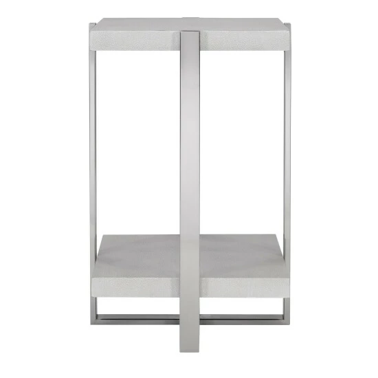 This clean contemporary accent table features crisp layers of faux shagreen shelves in milk white with a light grey glaze, secured by steel supports in a plated brushed silver finish.