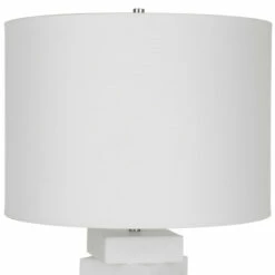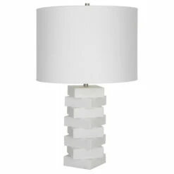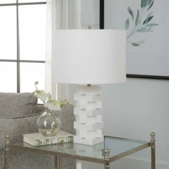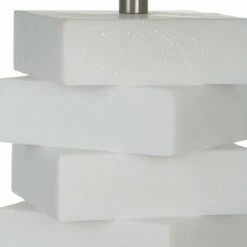 The Ascent table lamp showcases a unique geometric design with alternating stacked blocks constructed from a man-made ivory stone that accurately replicate the look of thassos marble. Iron details are finished in a plated brushed nickel.