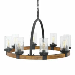 Heavy gauge real wood frame wooden wagon wheel, finished in a mid tone, featuring clear seeded glass shades. A nod to industrial design is found in the iron wrapped frame, and large circular hook. The metal work is in a deep weathered bronze finish with a slight texture and black antiquing. 8-60 watt max Edison sockets, for a decorative effect we have included 8-60 watt antique style BT58 amber bulbs. Includes 20-feet wire and 7-feet chain.