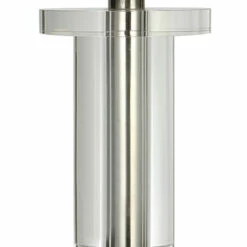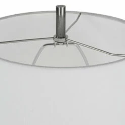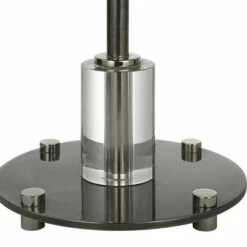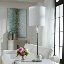This steel buffet lamp features clean, simple detailing with a polished nickel base and unique foot, adorned with thick crystal accents. The round hardback shade is wrapped in white linen fabric.