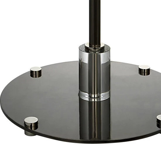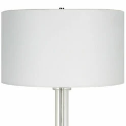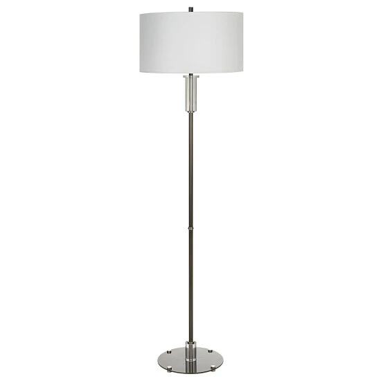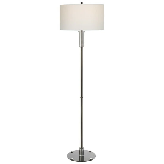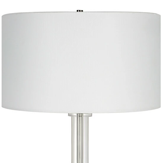 This steel floor lamp features clean, simple detailing with a polished nickel base and unique foot, adorned with thick crystal accents. The round hardback shade is wrapped in white linen fabric.