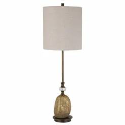 Finished in a plated dark bronze with crystal accents, this buffet lamp showcases a bright gold leaf ceramic accent with a unique, organic look and fine textural detail. The lamp is accented by a round light oatmeal linen fabric shade.