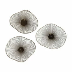 This contemporary set of 3 metal wall arts features 3-dimensional organically curved shapes with radiating metal spokes, finished in a plated gold with mirrored center accents.