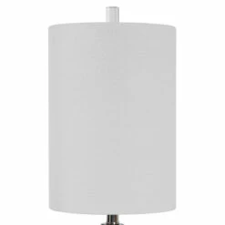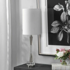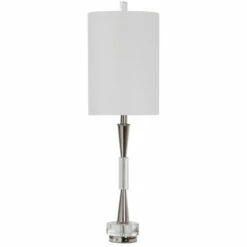 This clean and contemporary buffet design has an alternating polished nickel and crystal base that exudes modern elegance. The round hardback shade is a white linen fabric.