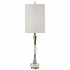 This clean and contemporary buffet design has an alternating polished nickel and crystal base that exudes modern elegance. The round hardback shade is a white linen fabric.