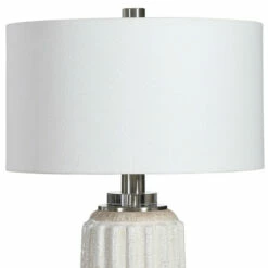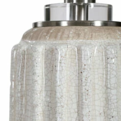 A nod to old world style, this ceramic table lamp features a distressed cream and beige crackle glaze with a deep ribbed texture, accented by brushed nickel and crystal details. A white linen fabric drum shade completes the look.