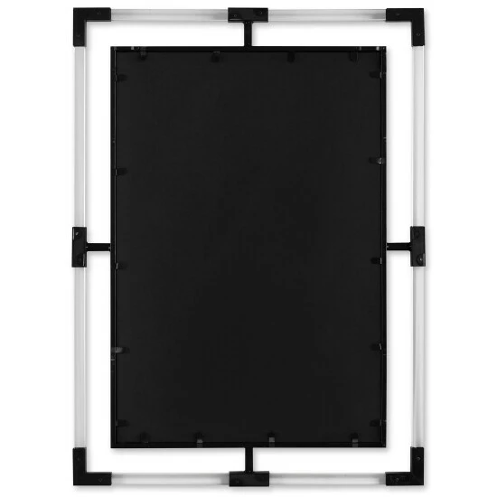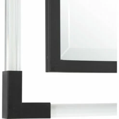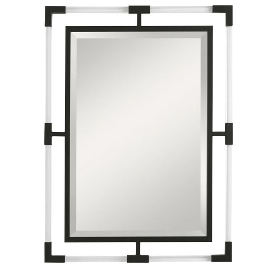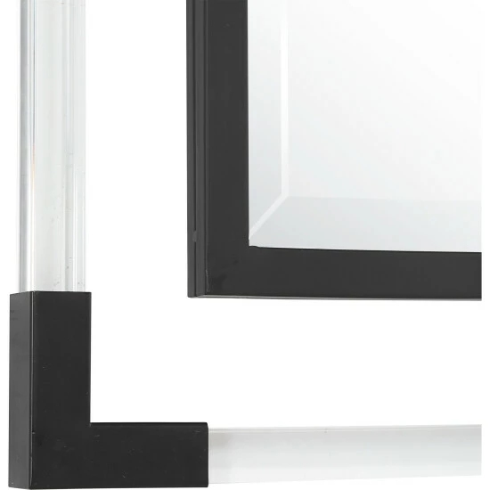 This mirror can certainly serve as a focal point for any room. Combining forged iron finished in matte black, with suspended, clear acrylic, solid bars creating a modern feel. Mirror has a generous 1 1/4 inches bevel and may be hung horizontal or vertical.
