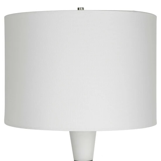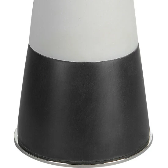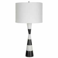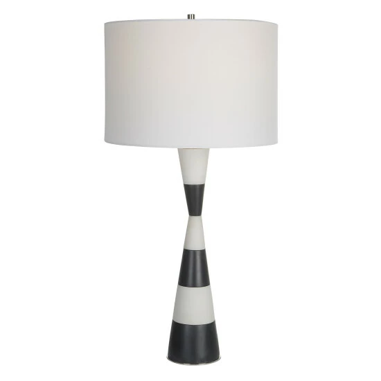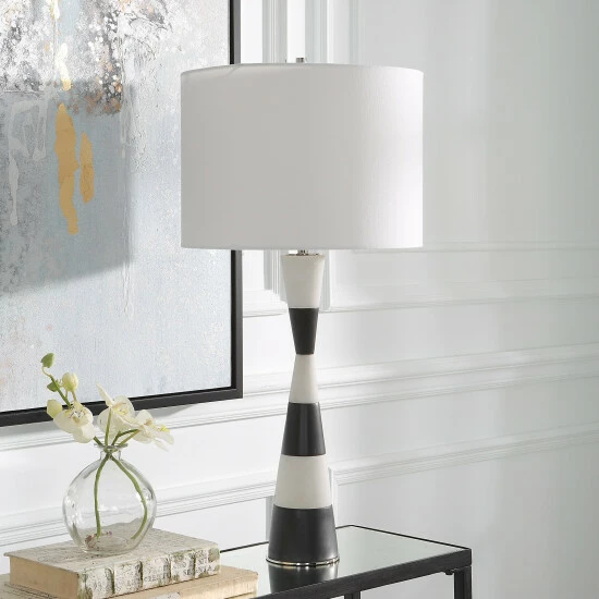The Bandeau lamp is crafted from a banded black and white man-made stone that accentuates its hourglass shape and accurately replicates the look of thassos marble. Iron details are finished in polished nickel. Paired with a white linen fabric drum shade.