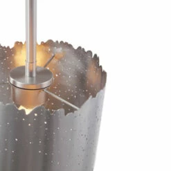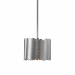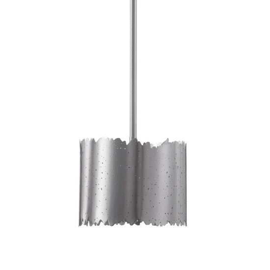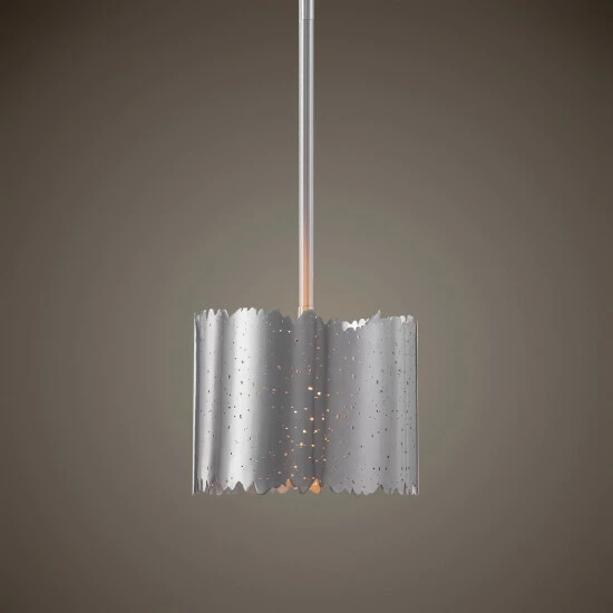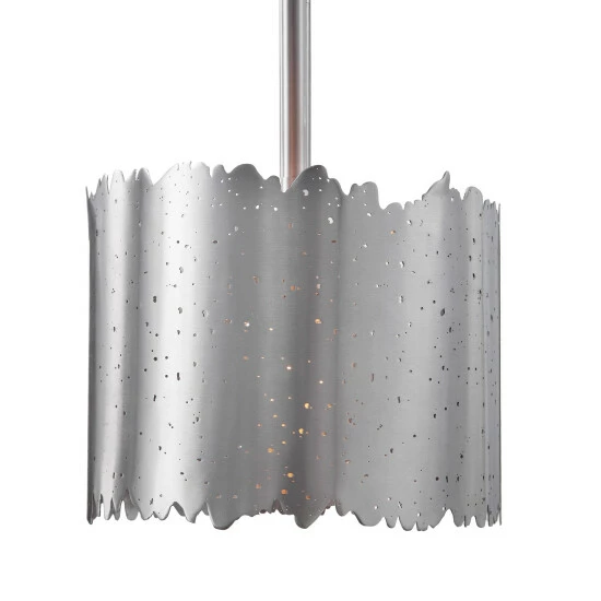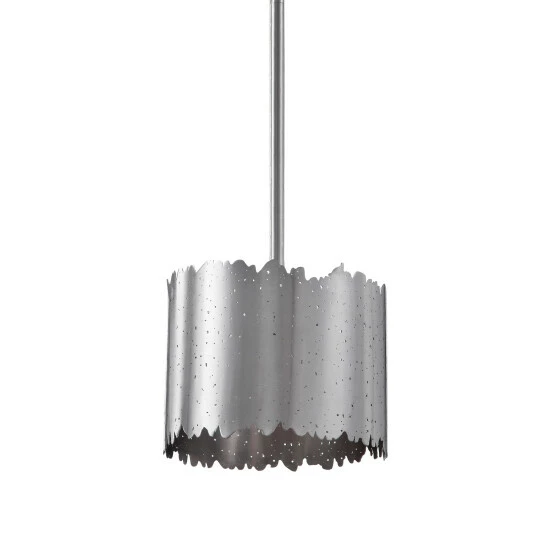 Modern in design feel, our 1 lt. mini pendant is finished in a satin brushed nickel featuring a pierced metal shade with raw jagged edges. With 1-60 watt max edison socket, and includes 15 feet wire, and 3-12 inches stems and 1-6 inches stem for adjustable installation.