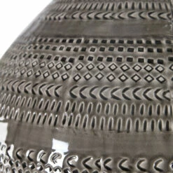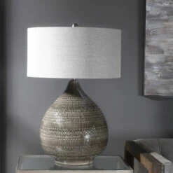 Showcasing a large ceramic base, this table lamp is finished in a taupe grey glaze with a tribal embossed pattern. The hardback drum shade is beige linen fabric with natural slubbing. Due to the nature of fired glazes on ceramic lamps, finishes will vary slightly.
