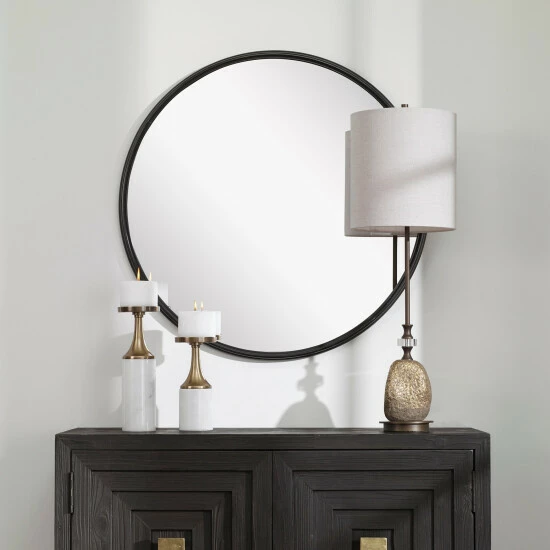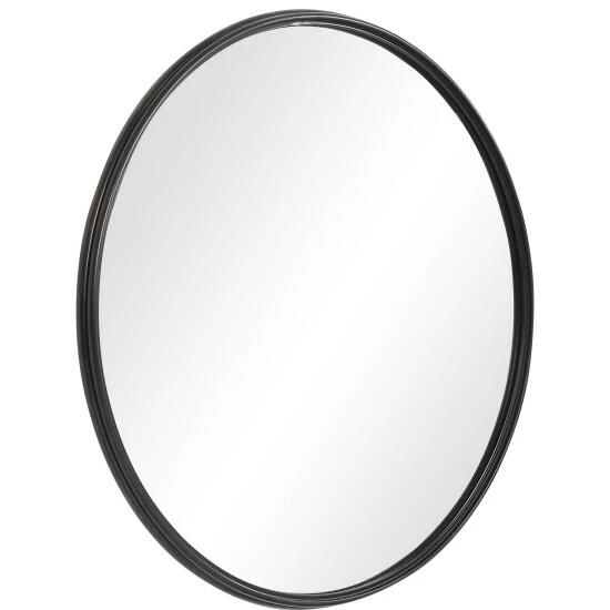 This sophisticated round mirror showcases a solid iron frame with a raised rounded edge finished in an aged black. The simplicity of the design enables easy placement in an array of styled spaces.