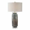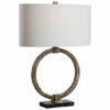 Brushed brass plated metal accented with a thick crystal foot. Theround hardback shade is an off-white linen fabric.