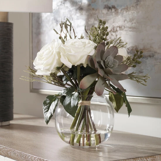 Modern floral bouquet features a unique mix of berries, greenery, seed pods, succulents and cream roses in a clear glass bud vase with faux water.