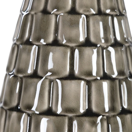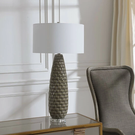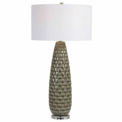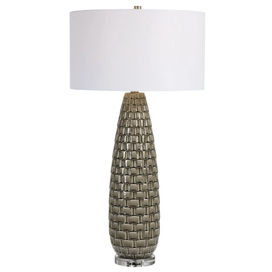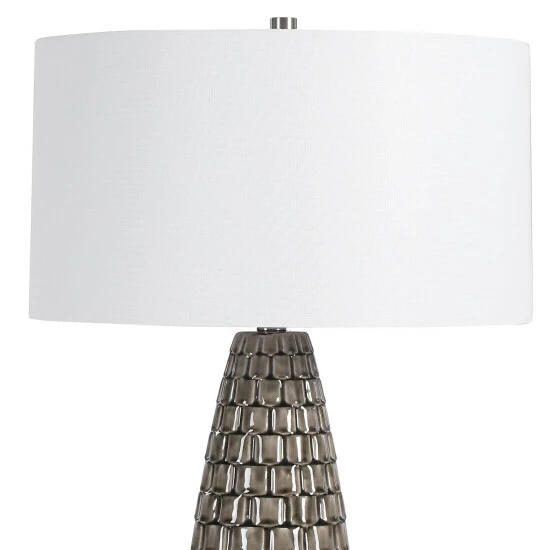 This ceramic table lamp features a contemporary stack tile design finished in a charcoal grey crackle glaze, accented with brushed nickel details and a thick crystal foot. A white fabric drum shade completes the look.