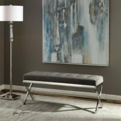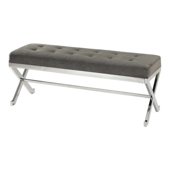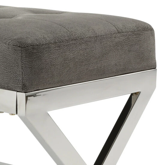 Elevate your entryway with this sleek steel bench from Uttermost. The polished x-shaped frame is topped with a plush, slate grey cushion, textured and button-tufted for added depth. Pair this piece with matching silver hardware to create a cohesive, contemporary look.