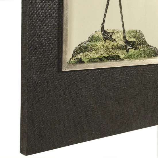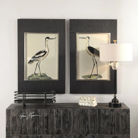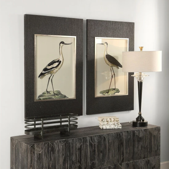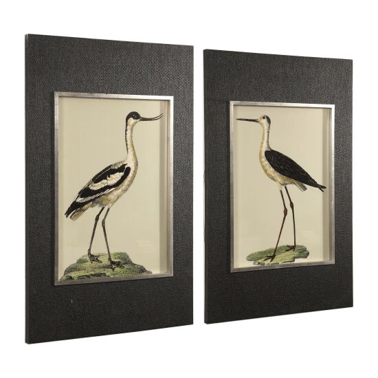 These coastal bird prints feature charcoal, off-white, green, reddish brown and gold/tan shadows on off-white backgrounds. Frames are covered in dark charcoal grass cloth with silver leaf inner lips. Prints are under glass.
