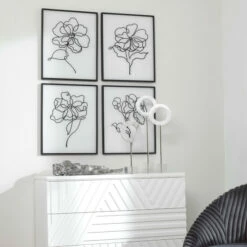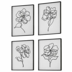 Simple yet elegant, this artwork makes a beautiful statement with a classic black and white palette. Each modern floral sketch is executed on back painted white glass with a slim black frame.
