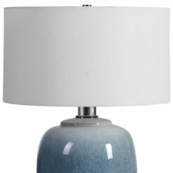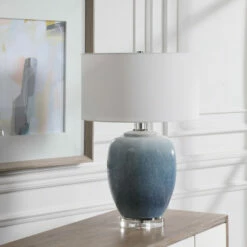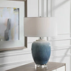 Ceramic table lamp showcases vibrant shades of cobalt and aqua that transition into a subtle ombre toned light blue. Polished nickel details and crystal accents create an elegant and sophisticated look. A crisp white linen drum shade accents the piece.