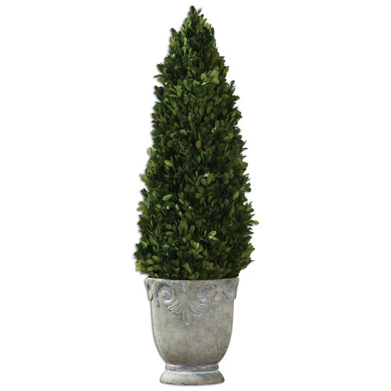 This topiary silk plant features a preserved, natural evergreen foliage set in a light stone finished, ceramic planter. A lovely addition to any home decor, its evergreen style and durable nature will last for years.