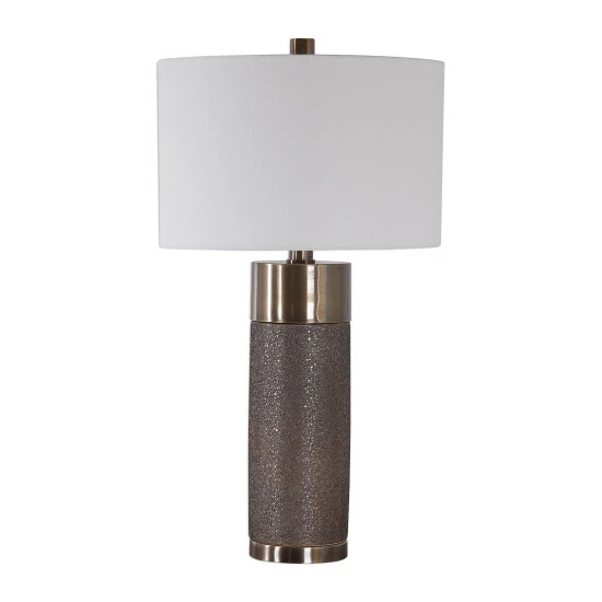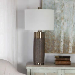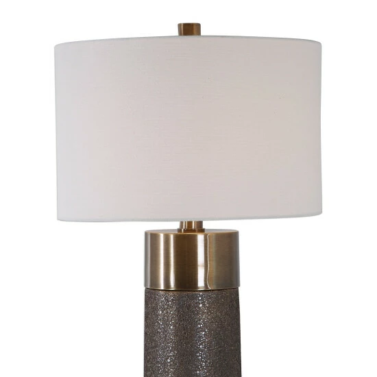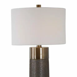 This contemporary table lamp design showcases a heavily textured ceramic base that’s finished in a metallic golden bronze, paired with antique brass plated iron details. A hardback drum shade in an off-white linen fabric completes this piece.