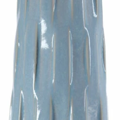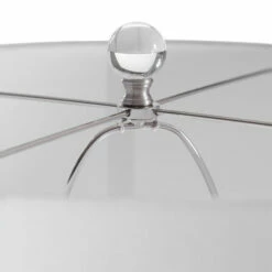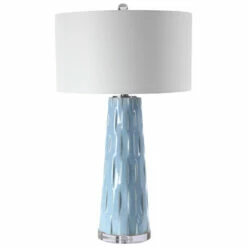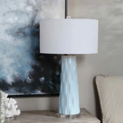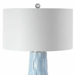This ceramic table lamp features a wavy alternating texture finished in a light powder blue glaze with cream undertones, accented with brushed nickel plated details and a thick crystal foot. The round hardback drum shade is a white linen fabric. Due to the nature of fired glazes on ceramic lamps, finishes will vary slightly.