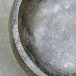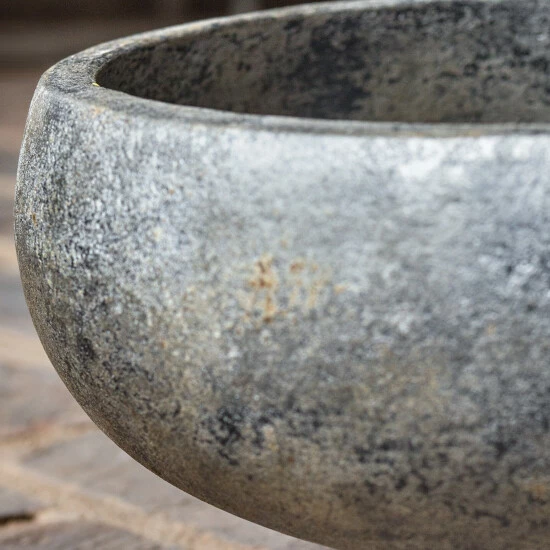 Terracotta bowl finished in an aged black with gold highlights and accented by a water hyacinth covered base.