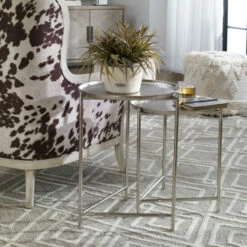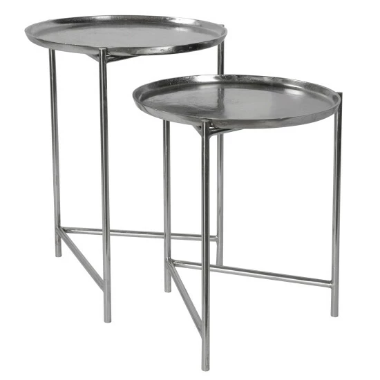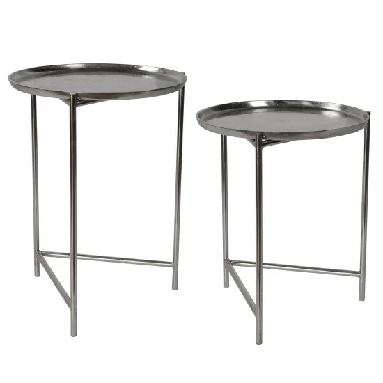 This set of functional nesting tables feature iron frames accented by textured cast aluminum tray tops, finished in nickel.