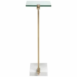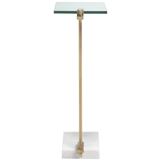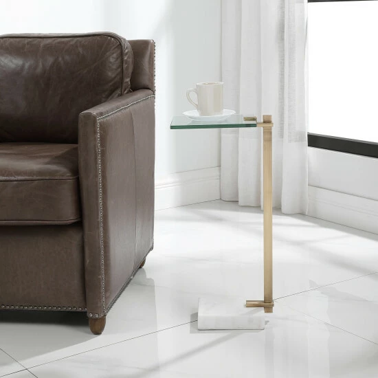 This perfect pull-up table pairs an updated design with timeless finishes. The tempered glass top is supported by a brushed brass plated stainless steel base accented by an elegant white marble foot with natural veining.